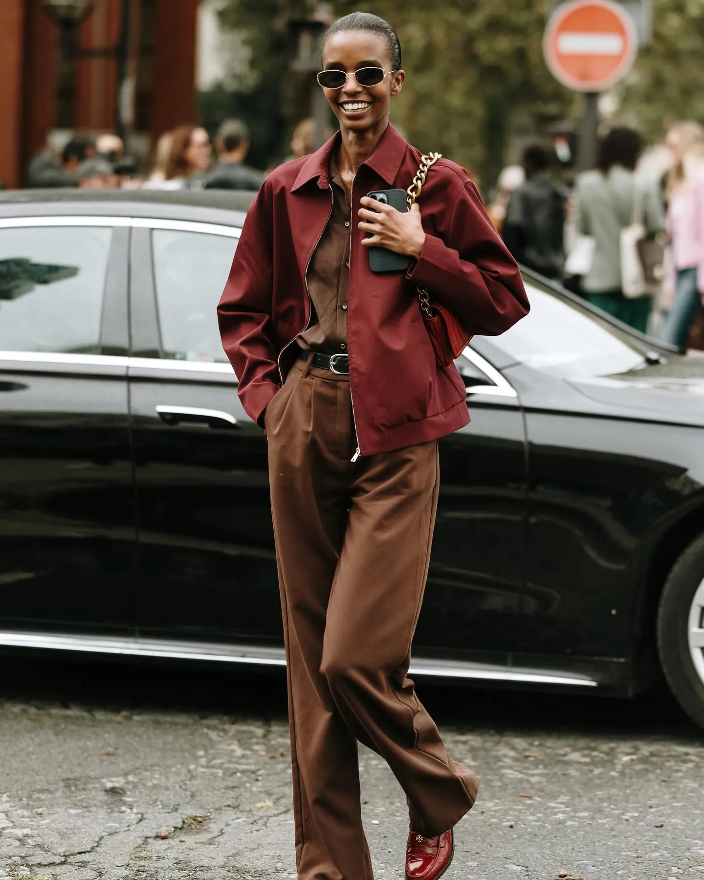 Червоні лофери тут задають тон буквально. Поєднання бордо, граната і каштанового з вишневими лаковими лоферами — справжній майстер-клас з осінньої тональності.