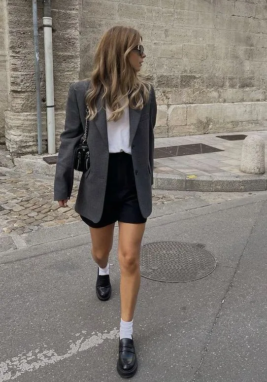 Теплий офісний образ: подовжений піджак і шорти створюють вивірену базу, а масивні лофери додають характеру. Стильно, практично і небанально.