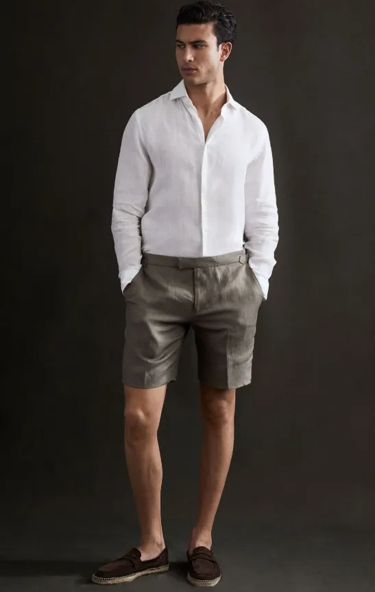 Шоколадно-коричневі лофери з сіро‑чінос шортами та лляною сорочкою / Reiss