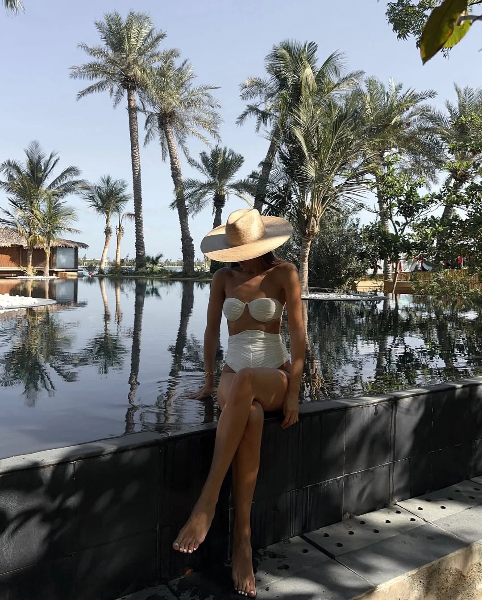 Всегда уместен для отдыха купальник в белом или черном цвете. Идеальным вариантом является сдержанный дизайн и лаконичный крой. Для создания монохромного образа, подбирайте головной убор к цвету купальника.