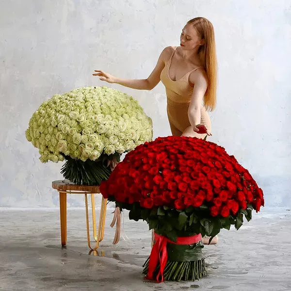 Букеты из цветочного магазина La Flora состоят из красных и белых роз. За 602 цветка высотой 50 сантиметров придется выложить почти 230 тысяч гривен. Вероятно, такие букеты по 301 розе можно купить отдельно, впрочем именно эта композиция продается вместе.
