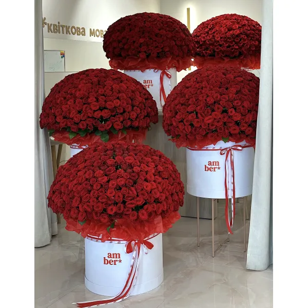 Известный цветочный магазин Amber предлагает приобрести аж целых 5 композиций в коробке по 501 красной розе. На сайте отмечается, что преимуществом таких букетов является то, что для них не нужна ваза, поскольку композиция сделана с помощью флористической губки, которая пропитана водой. Цена 5 букетов составляет 184 350 гривен.