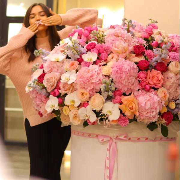 Огромная цветочная композиция высотой почти во весь рост человека от Amber обойдется в 70 тысяч гривен. В композиции есть разнообразные цветы – гортензии, пионы, розы, орхидеи и немало других цветов.