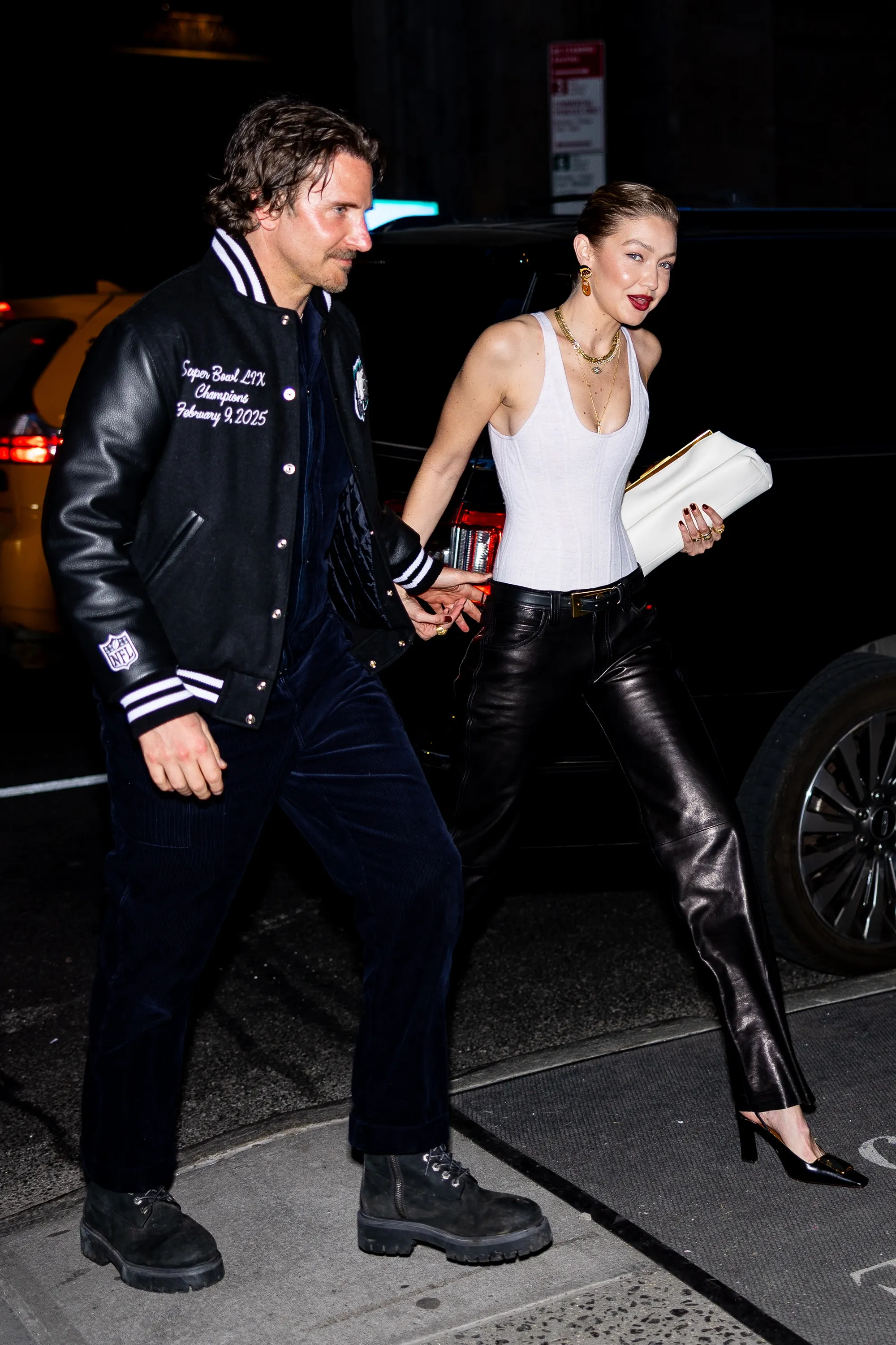 Поспішаючи на вечірку, манекенниця потрапила в об’єктив папараці зі своїм бойфрендом Бредлі Купером, який був одягнений у синій оксамитовий костюм та шкіряний бомбер.