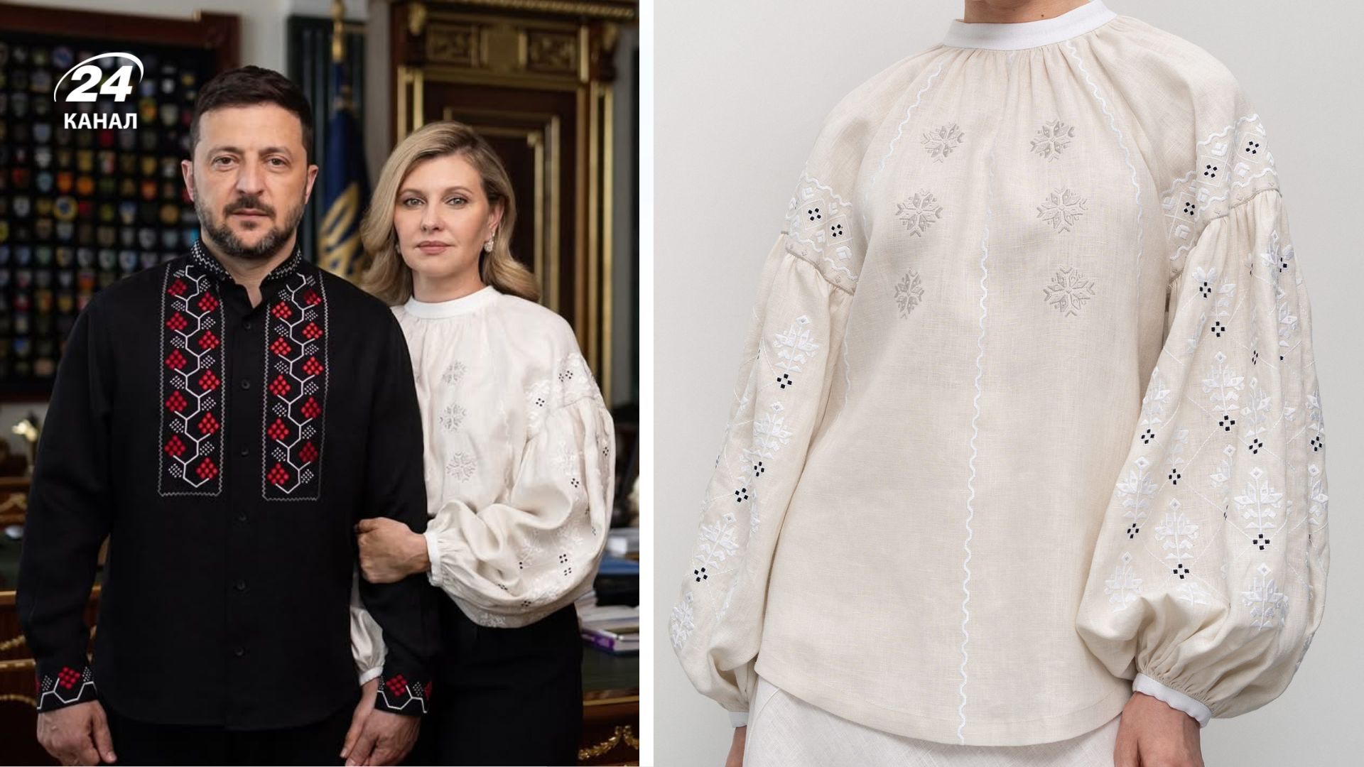 Перша леді одягнула вишиту білим по білому полтавську сорочку від бренду Etnodim зі спільної колекції з музеєм Івана Гончара. Широкі рукави прикрашає традиційний орнамент: сітка з ромбів, у кожен з яких вписане деревце.