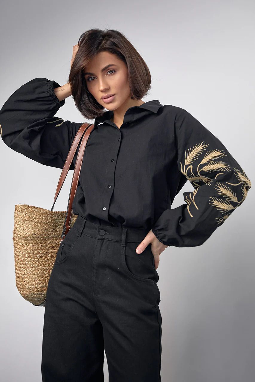 Бренд HOOTIR має в асортименті чорну сорочку з вишивкою у вигляді золотих колосків. Це чудова інтеграція етномотивів у повсякденні образи. Така сорочка прекрасно підійде на вихід, в офіс чи навіть для побачення.