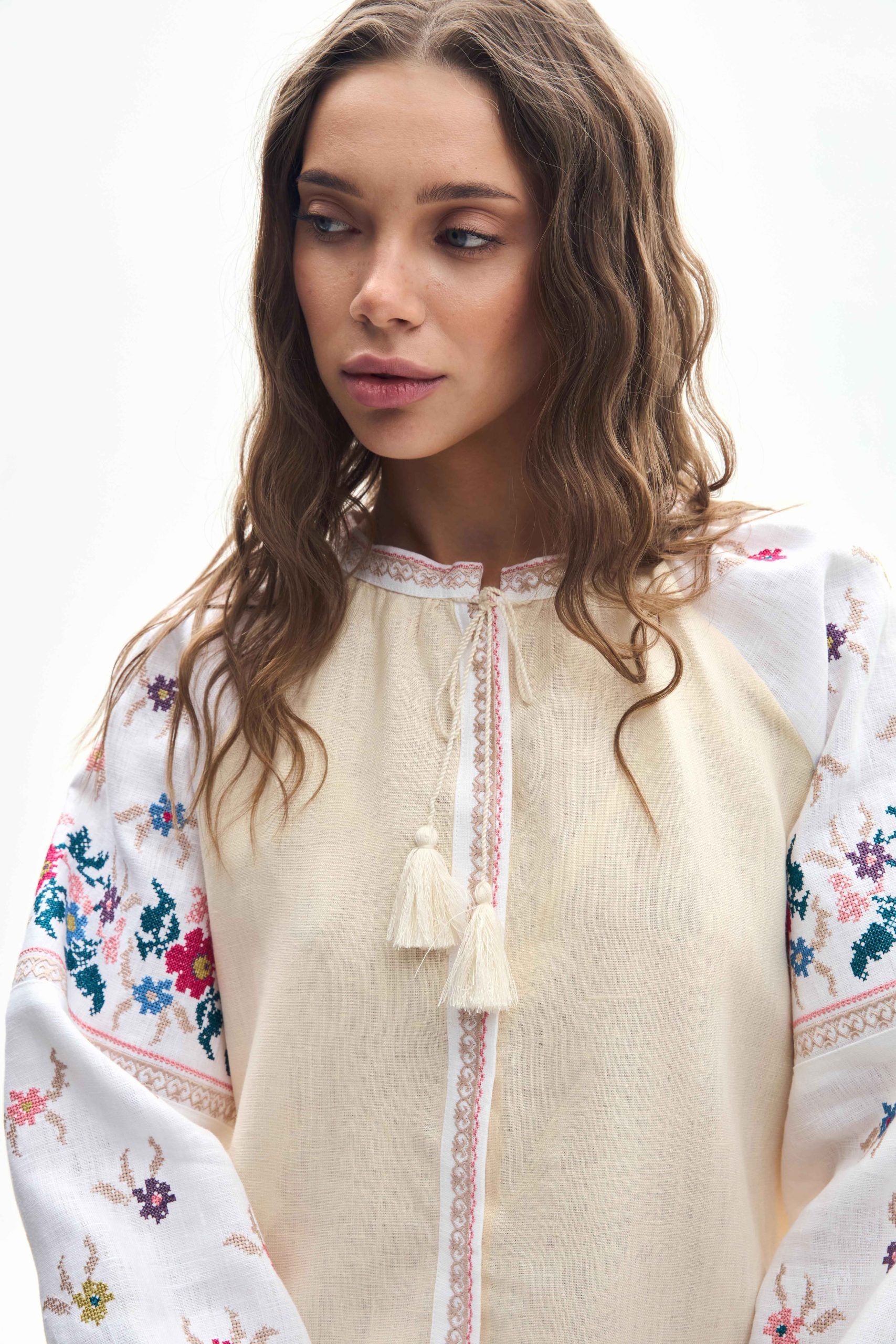 У бренду Galychanka в асортименті є цікава сорочка молочного кольору з бежевою вишивкою. Вона гарно підійде як на свято, так і на щодень.