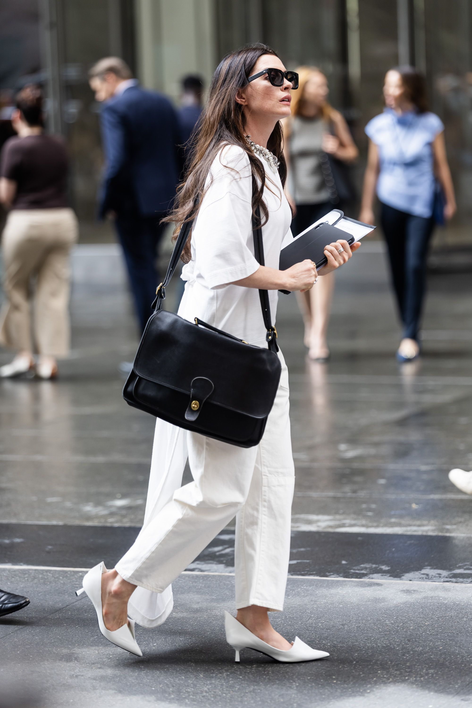 - Акторка Енн Гетевей під час зйомок "Диявол носить Prada-2" була помічена у вишуканому мінімалістичному вбранні з білою футболкою, штанами-сигаретами та аксесуарами.